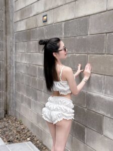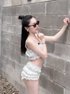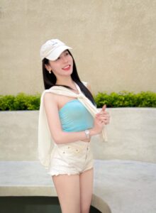 ผลงาน ที่เป็นกระแสที่สุดช่วงนี้ต้องยกให้เซ็ต ชุดว่ายน้ำ สีดำที่เธอนั่งอยู่บนอ่างน้ำกลางแจ้ง ท่ามกลางแสงเย็นที่เฉี่ยวลงมาตรงพอดี แบบเหมือนตั้งใจให้เป็นโกลเด้นอาวร์เฉพาะเธอคนเดียว ผิวเนียน ๆ ของเธอรับกับชุดว่ายน้ำสีเข้มได้อย่างลงตัว โชว์เอวคอดและช่วงไหล่เนียนแบบกำลังพองาม ใบหน้าหมวยหวานมีแก้มอมชมพูละเอียด ๆ ตัดกับรอยยิ้มมุมปากที่ดูรู้ทันโลกนิด ๆ ยิ่งทำให้ลุคนี้มีเสน่ห์แบบชวนหยุดดูโดยไม่รู้ตัว